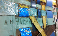 Woven metals, copper (repurposed from Château Frontenac roof), steel, band saw blades, aluminum, tin, text impressions.